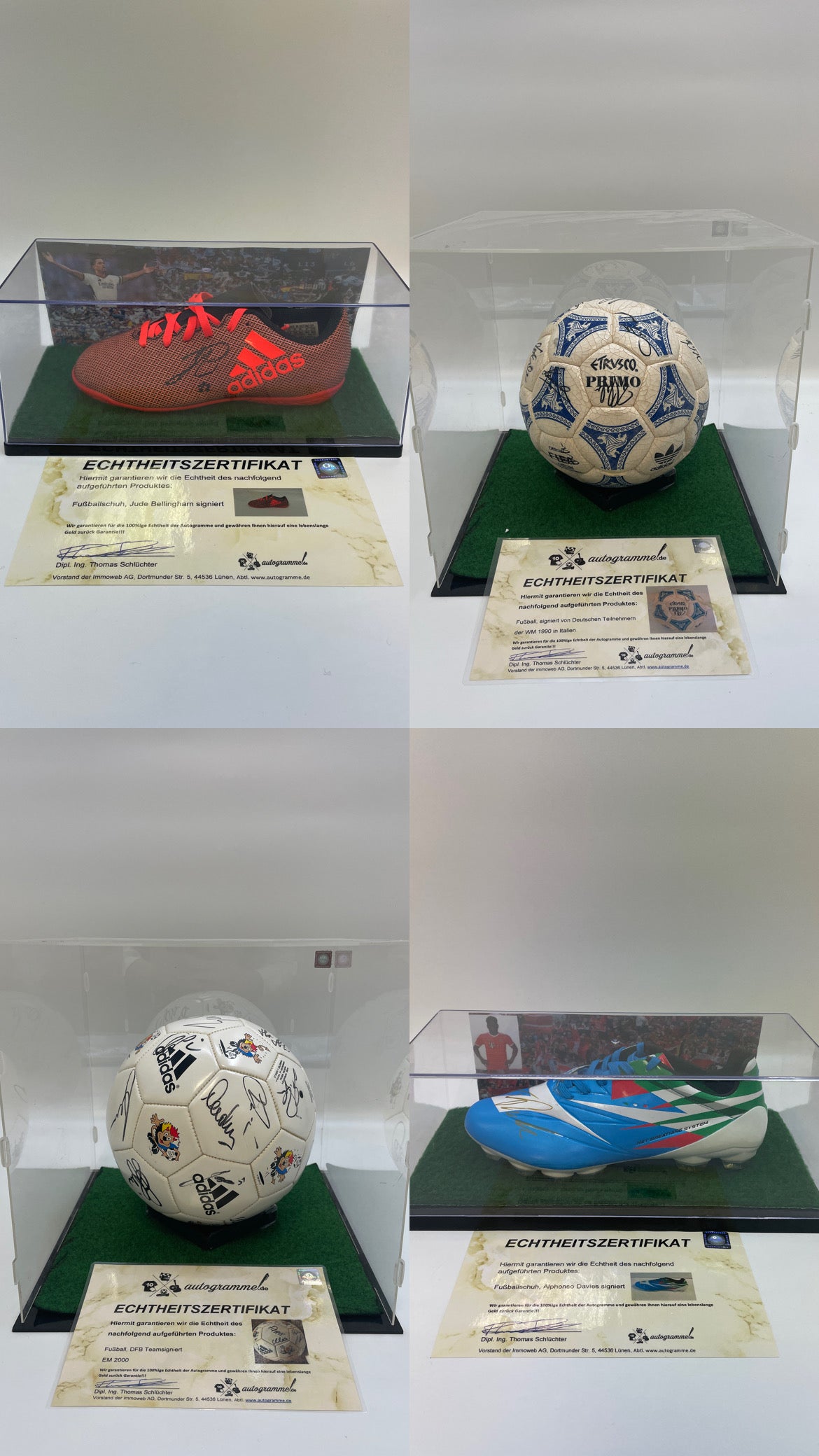 Sie sind auf der Suche nach etwas Besonderem? Dann werden Sie bei unseren signierten Fußballschuhen und Fußbällen mit Sicherheit fündig. Die stabilen Acryl-Vitrinen schützen Ihre Schätze zusätzlich und sind mit ihrer individuellen Gestaltung ein toller Blickfang!