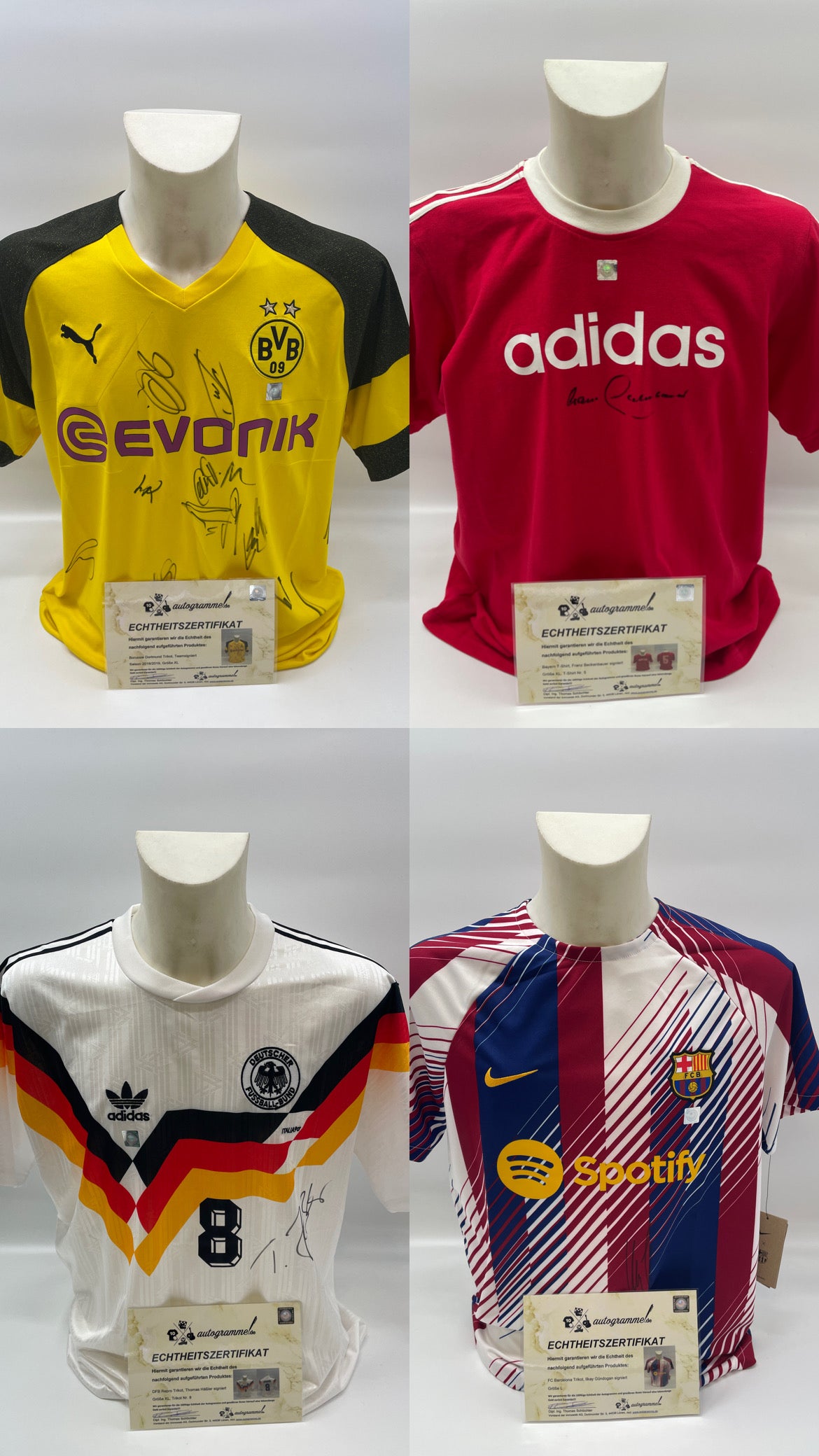 Ob von der Deutschen Nationalmannschaft, Deutschen Vereinsmannschaften oder verschiedenen Klubs und Nationalteams aus dem Ausland... Hier schlägt das Herz eines jeden Autogramm- und Fußballfans höher! Neben unseren bereits gerahmten Trikots haben Sie die Möglichkeit, auch diese von uns einrahmen zu lassen. Informationen hierzu finden Sie in den jeweiligen Angeboten.