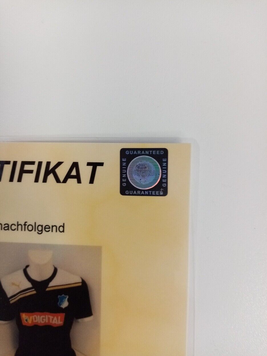 Hier erhalten Sie die Möglichkeit, ein von Spielern der Mannschaft der Saison 2011/2012 persönlich signiertes 1899 Hoffenheim Trikot in der Größe L zu erwerben. Das Trikot ist ungetragen, lediglich das Etikett ist nicht vorhanden. Über die Echtheit der Unterschriften erhalten Sie ein Echtheitszertifikat mit lebenslanger Geld-Zurück-Garantie. Der auf dem Trikot befindliche Hologrammaufkleber (Siehe Bilder) stellt die Verbindung zum Zertifikat dar.
