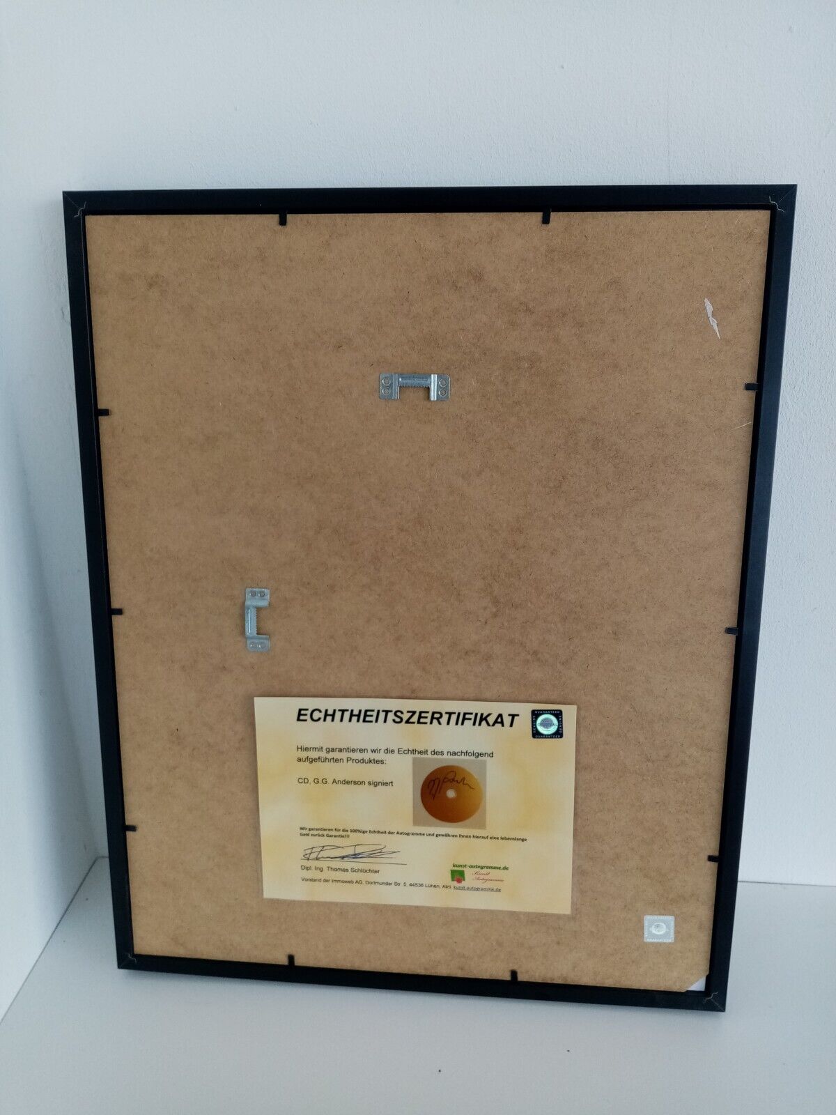 Hier erhalten Sie die Möglichkeit, eine von G. G. Anderson persönlich signierte CD zu erwerben. Bei der CD handelt es sich um einen Rohling, der mit goldener Folie beklebt wurde. Zusätzlich befindet sich ein Album im Rahmen. CDs und Cover befinden sich in einem einwandfreien Zustand. Die CD-Hülle wird separat mitgeliefert (Typische Gebrauchsspuren). Befestigt wurde alles mit Tesa-Stripes (Das Zertifikat mit doppelseitigem Klebeband) und lässt sich dementsprechend lösen. Der dazugehörige Bilderrahmen besitzt eine Kunststoffscheibe und wurde nur für das Einlegen der CD geöffnet. Folgende Maße hat der Bilderrahmen: