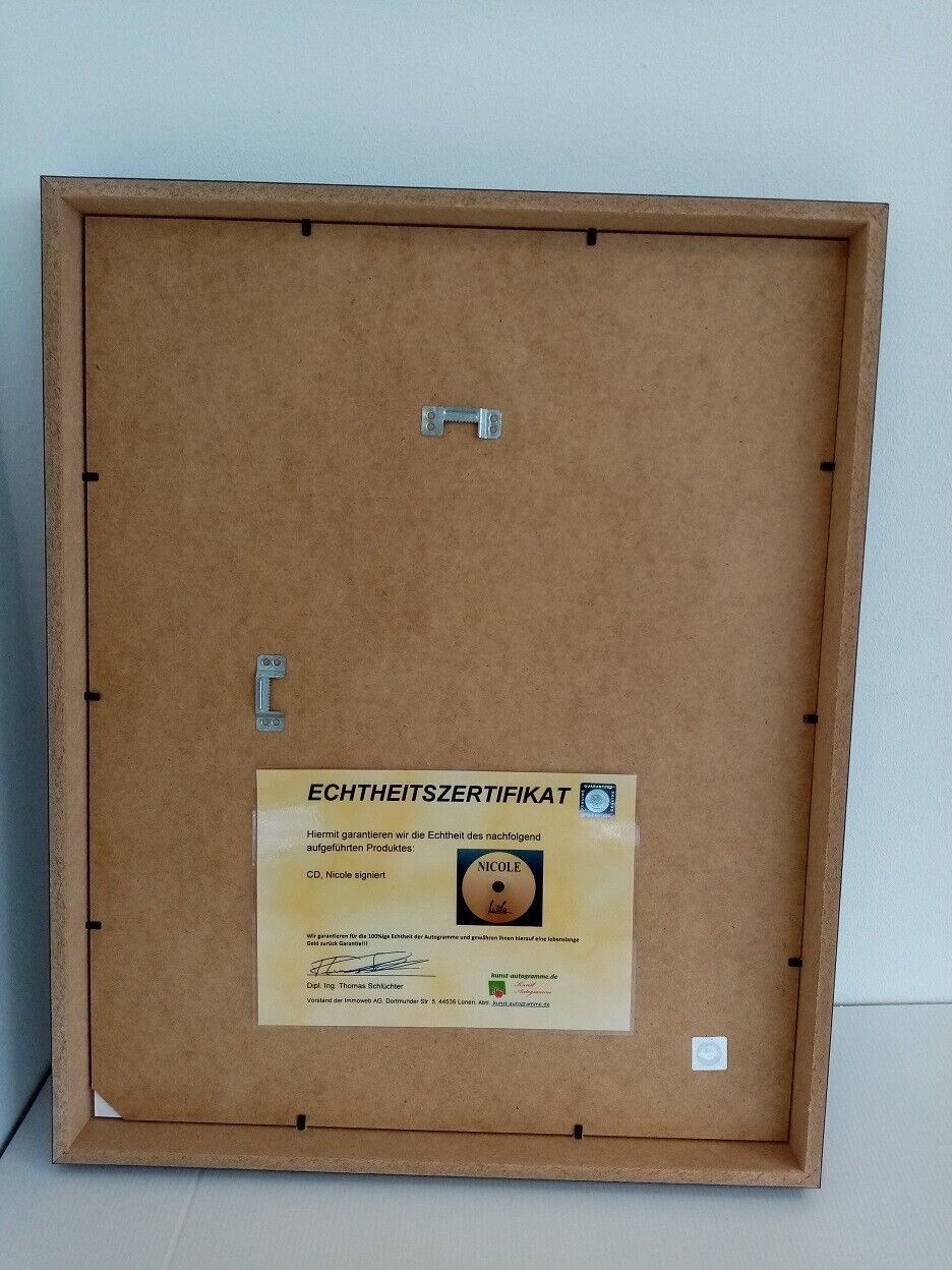 Hier erhalten Sie die Möglichkeit, eine von Nicole persönlich signierte CD zu erwerben. Bei der CD handelt es sich um einen Rohling, der mit goldener Folie beklebt wurde. Zusätzlich befindet sich ein Album im Rahmen. CDs und Cover befinden sich in einem einwandfreien Zustand. Die CD-Hülle wird separat mitgeliefert (Typische Gebrauchsspuren). Befestigt wurde alles mit Tesa-Stripes (Das Zertifikat mit doppelseitigem Klebeband) und lässt sich dementsprechend lösen.. Der dazugehörige Bilderrahmen besitzt eine Kunststoffscheibe und wurde nur für das Einlegen der CD geöffnet. Folgende Maße hat der Bilderrahmen: