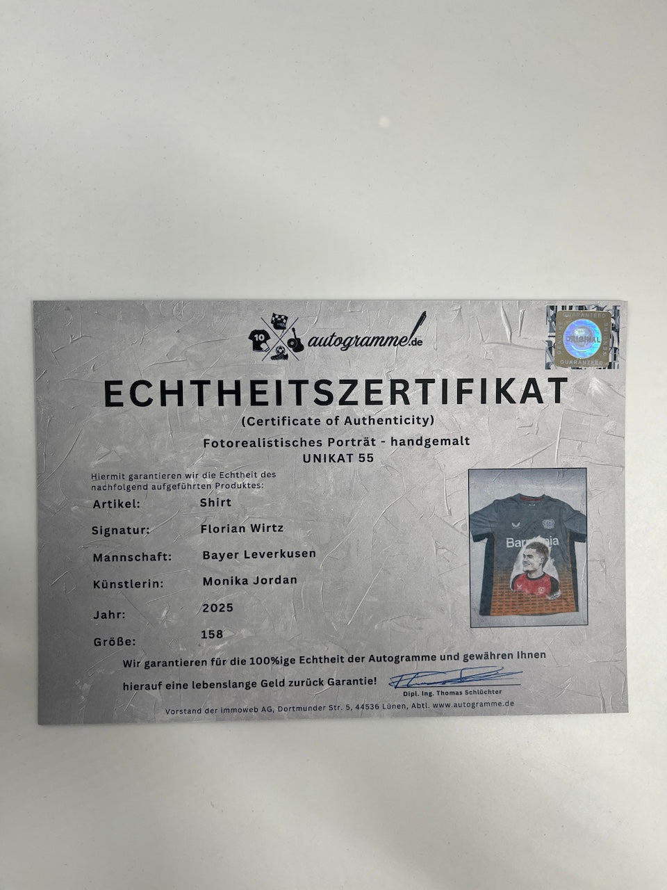 Das Shirt wurde von der Künstlerin Monika Jordan im Jahr 2025 bemalt und auch von ihr selbst signiert. Es handelt sich um ein Unikat (1/1).