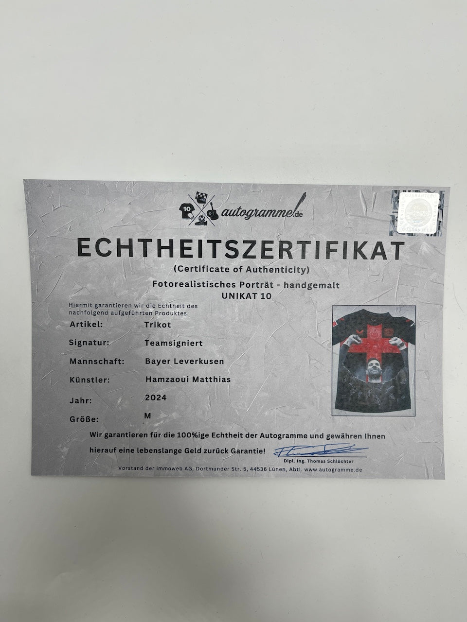Hier erhalten Sie die Möglichkeit, ein teamsigniertes Leverkusen Trikot in der Größe M zu erwerben.