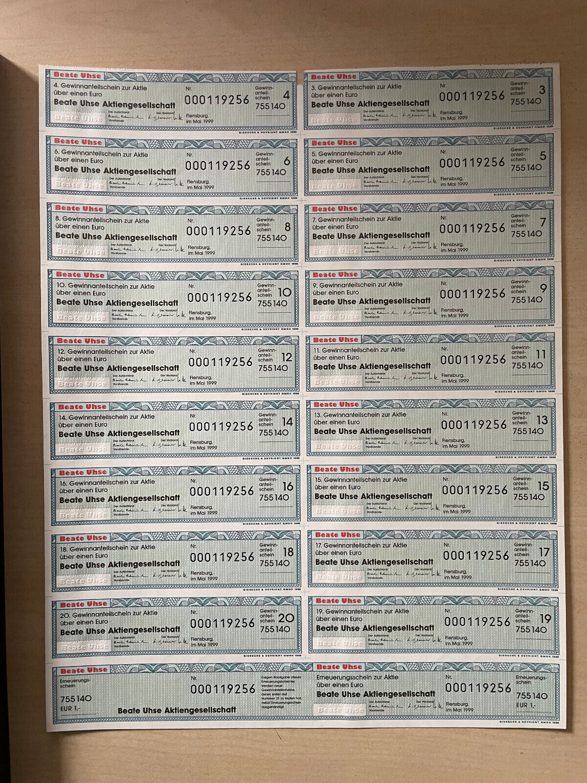 Originale Beate Uhse Aktie mit Original Unterschrift von Beate Uhse und Christian Lindemann. Christian Lindemann war lange Zeit als Vorstand des Unternehmens bestellt, Beate Uhse zum Zeitpunkt der Unterschrift im Aufsichtsrat tätig. Das Besondere an der Aktie sind diese beiden original Unterschriften, die sich neben den gedruckten Unterschriften auf der Aktie befinden. Die Unterschrift von Lindemann ist auf der Aktie links (siehe roter Pfeil im ersten Bild), die von Beate Uhse auf dem Passepartout.