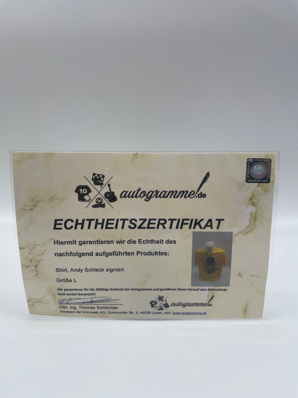 Als zusätzlichen Service bieten wir Ihnen an, das Trikot gegen einen Aufpreis von 50 Euro einzurahmen (Siehe Beispielbilder). Bitte kontaktieren Sie uns nach Kauf, falls Sie dieses Angebot in Anspruch nehmen möchten. Der Rahmen besitzt eine Kunststoffscheibe und wird nur für das Einlegen des Trikots geöffnet. Maße des Rahmens: Höhe 94,5 cm, Breite 63,5 cm.