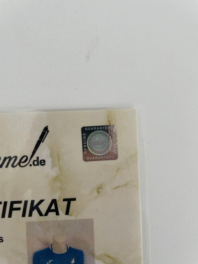 Als zusätzlichen Service bieten wir Ihnen an, das Trikot gegen einen Aufpreis von 50 Euro einzurahmen (Siehe Beispielbilder). Bitte kontaktieren Sie uns nach Kauf, falls Sie dieses Angebot in Anspruch nehmen möchten. Der Rahmen besitzt eine Kunststoffscheibe und wird nur für das Einlegen des Trikots geöffnet. Maße des Rahmens: Höhe 94,5 cm, Breite 63,5 cm.