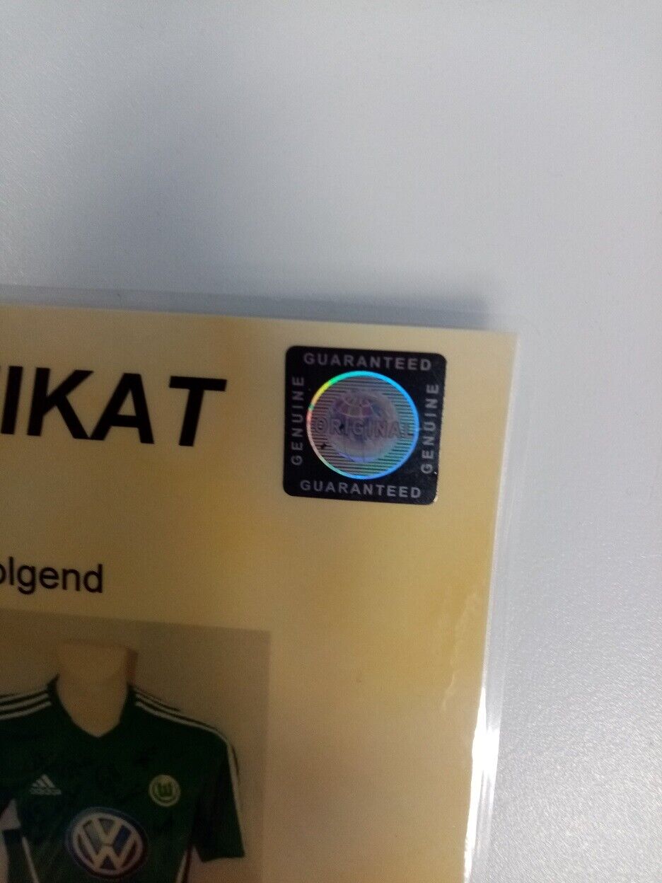 Hier erhalten Sie die Möglichkeit, ein von Spielern der Mannschaft aus der Saison 2012/2013 persönlich signiertes VFL Wolfsburg Trikot in der Größe M zu erwerben. Es handelt sich hierbei um ein Trainingstrikot! Die linke Schulter ist leicht verschmutzt (Siehe Bild). Ansonsten befindet sich das Trikot in einem sehr guten Zustand. Über die Echtheit der Unterschriften erhalten Sie ein Echtheitszertifikat mit lebenslanger Geld-Zurück-Garantie. Der auf dem Trikot befindliche Hologrammaufkleber (Siehe Bilder) stellt die Verbindung zum Zertifikat dar.