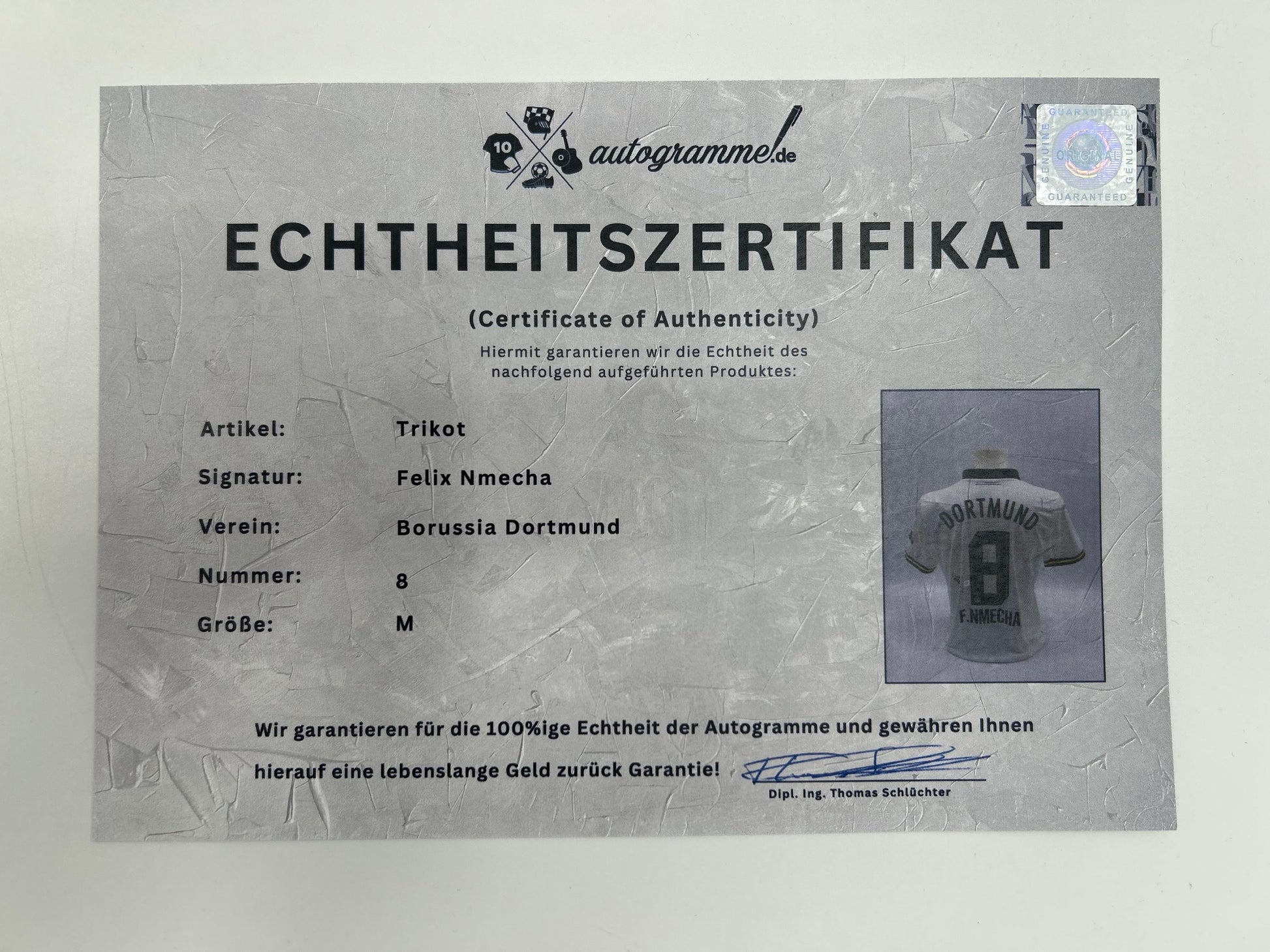 Here you have the opportunity to receive a personally signed copy by Felix Nmecha. Borussia Dortmund Jersey in size M The jersey is unworn and the tag is present. You will receive a certificate of authenticity with a lifetime money-back guarantee confirming the authenticity of the signature. The hologram sticker on the jersey (see pictures) represents the connection to the certificate.